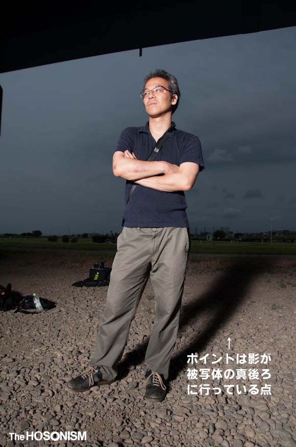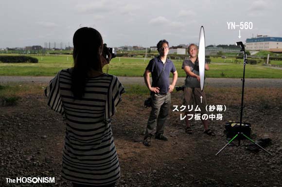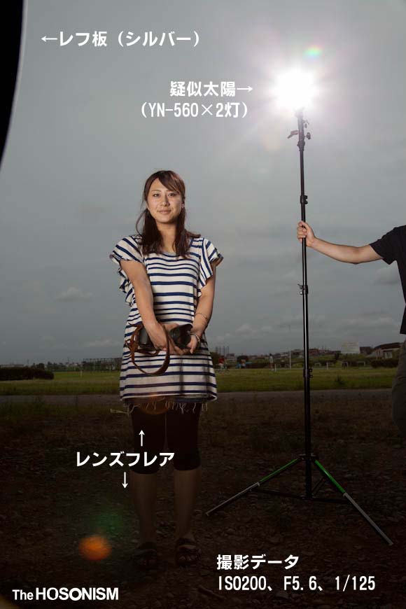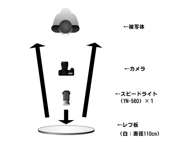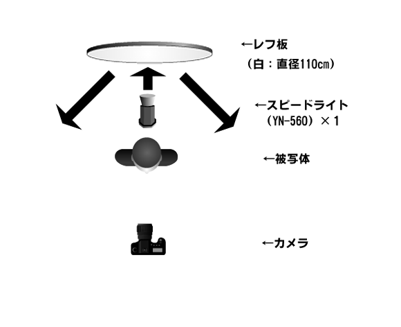要するに撮影者の「後ろ」でストロボをレフ板に当ててバウンスさせている、ということです。直径110cmくらいあると、それなりに大きな光源になるので全身をカバーできるくらいの光源になる。